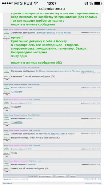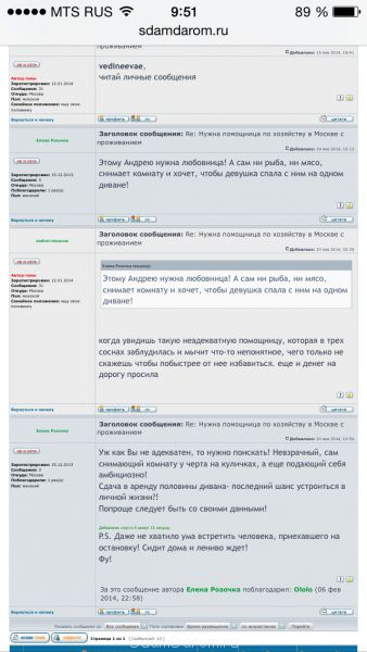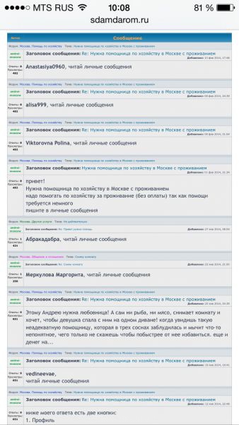 Поискала в своей истории ЛС, т.к. Мне он тоже писал, хотя я ничего не искала и не спрашивала. Вот такое сообщение: "могу подселить к себе в комнату в москве, бесплатно за помощь по хозяйству андрей. когда хочешь переехать? Отправлено: 25 фев 2013, 19:56"