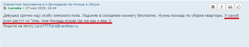 Девушка ищет девушку или женщину или бабушку. Проживание бесплатно. Необходимо лишь поддерживать чистоту и готовить не часто, по мере необходимости. То есть подразумевается совместное проживание в отдельной комнате. Комната к сожалению пустая. Чистая, со свежим ремонтом и занавесками. Разумным, порядочным и адекватным людям Велком. Не о каком интиме речи быть не может. Мало того, общение ненавязчивое, по мере необходимости решения общих бытовых и жизненных вопросов. Поддерживать финансово к сожалению возможности нет, потому необходимо чтобы это был человек с собственным доходом или финансовой поддержкой своих друзей или родственников. В квартире взаимное уважение. Необходима предварительная уборка после проживания предыдущего жильца.