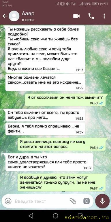 Ты что с ним переписываешься? Гей что-ли или задрот, которому делать нех@й, больной ты на всю бошку!ALEX_EY: 03 сен 2020, 10:26 дедушка просто очень озабоченный на сексе, стихах и христианстве - ему некогда глупостями заниматься......![]()